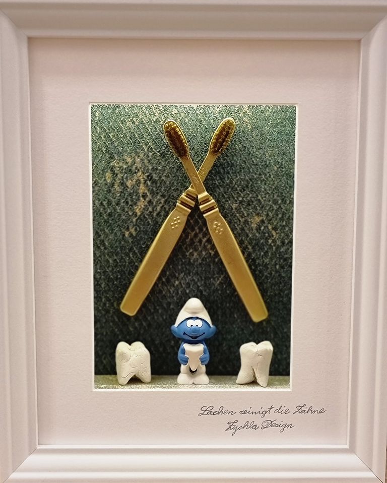 Handmodellierte Backen- und Schneidezähne, in der Mitte ein zahntragender Schlumpf und vergoldete Zahnbürsten verschönern ein Zimmer einer großartigen Zahnärztin