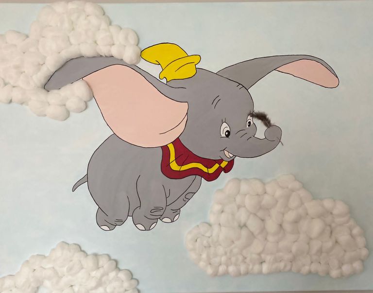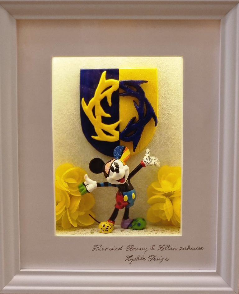Designer Mickey Mouse umgeben von gelben Blumen sowie im Hintergrund ein handmodelliertes Wappen der österreichischen Stadt Erl