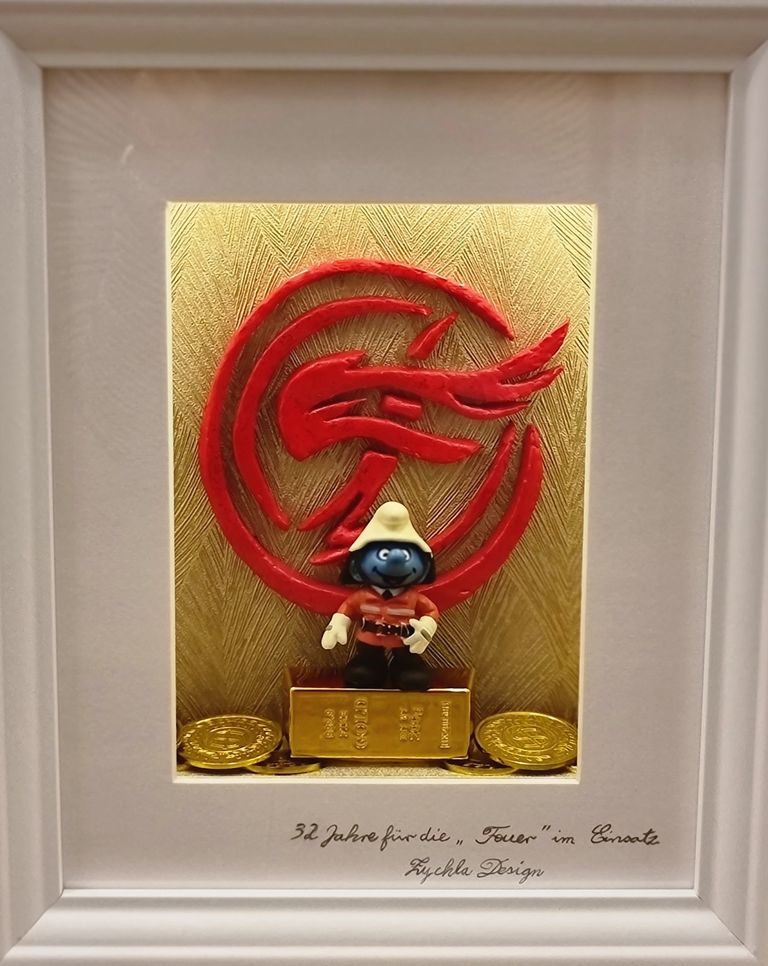 Im Vordergrund ein Schlumpf-Feuerwehrmann als Ausdruck eines Hobbys, im Hintergrund ein handmodelliertes Firmenlogo mit symbolischen Goldmünzen / Goldbarren der langjährigen Tätigkeit.
