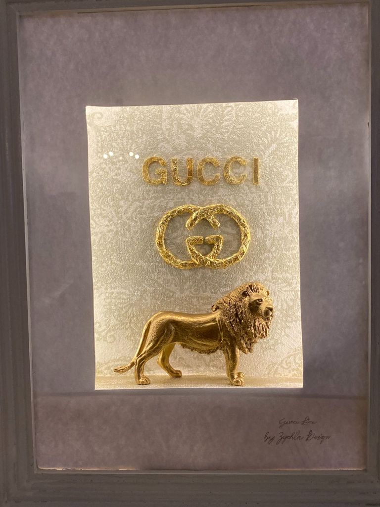 Für einen Gucci Liebhaber erstellt . Handmodelliertes Gucci Emblem mit Blattgold überzogen und mittig der Löwe platziert. Zur besonderen Geltung kommt der Löwe durch den beleuchteten Hintergrund.