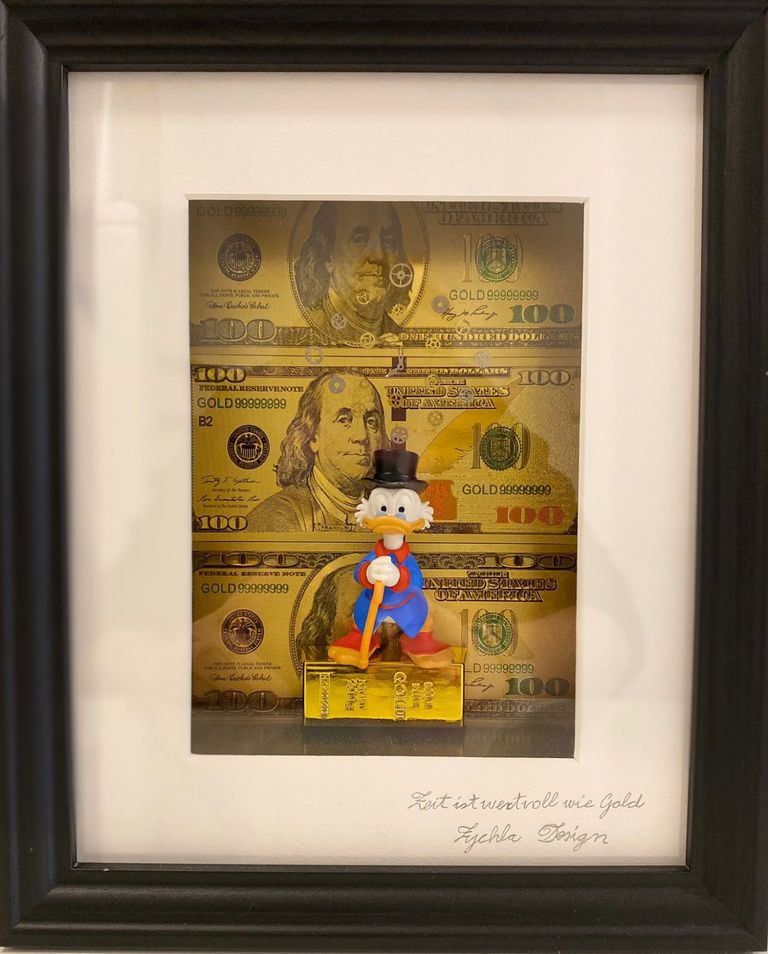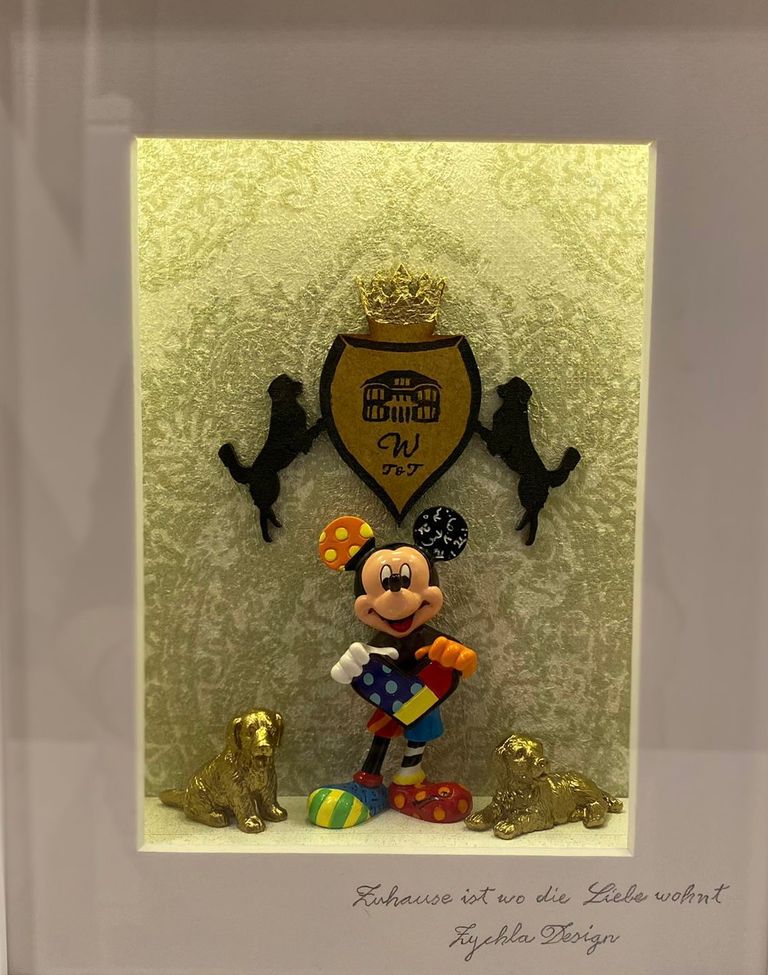 Designer Mickey Mouse mit vergoldeten Goldies und im Hintergrund ein Familienwappen mit Krone aus 14 K Blattgold