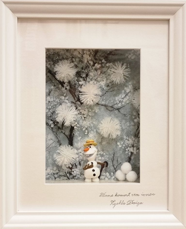 Schneemann Olaf aus "Die Eiskönigin" steht im Mittelpunkt einer winterlichen Landschaft umgeben von glitzernden Schneeflocken.