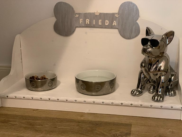 Handgefertigt mit weißer Farbe ( für Tiere geeignet) gestrichen und mit Glitzersteinen an der abgerundeten Front versehen.