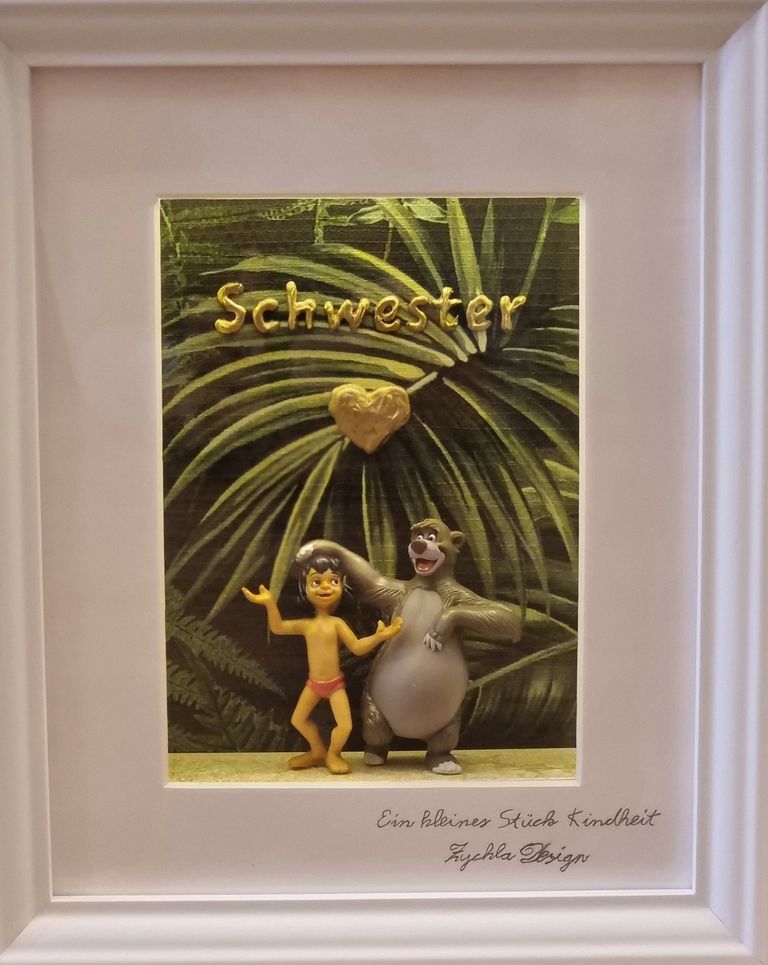 Mogli & Balu umgeben von Dschungelmotiven und mit einem Herz , das mit Blattgold veredelt wurde